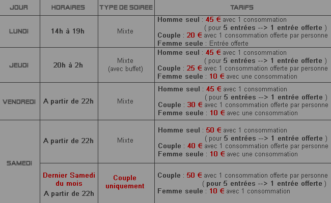 - Facilities: Dancefloor with cages and pole bars; round bed; lounges and private corners; spa with jacuzzi and hammam; showers; changing rooms; terrace; dining area with fireplace; indoor smoking area; wooded park with naughty chalet; private and closed parking; CCTV