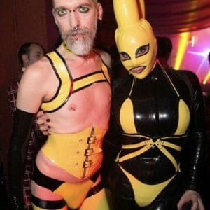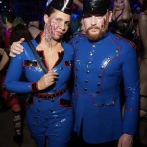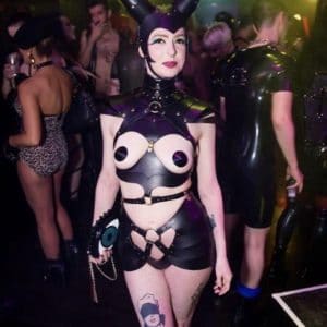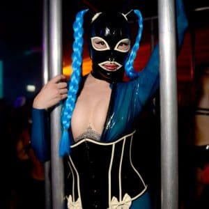 The TG dress code strives to avoid narrow limitations and encourage individual imagination and diversity. A modern fetish club is is more about fantasy and transformation than just rubber and leather. Also, many of the best outfits seen at TG are made by those wearing them or assembled from various second hand articles (i.e.: theatrical costume or uniforms). So if you can’t afford expensive latex or leather costumes then explore personal fantasies and use your imagination, or even try body paint! Please always remember that if your outfit wouldn’t turn heads in the street – don’t bother to wear it to Torture Garden. Also, many of those attending bring their outfit in a bag and get changed within the club.